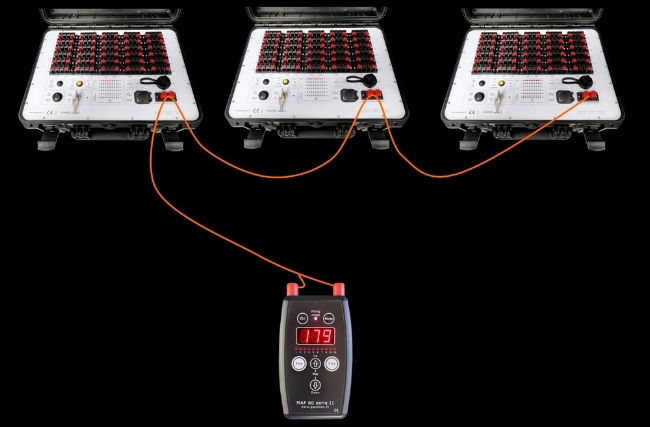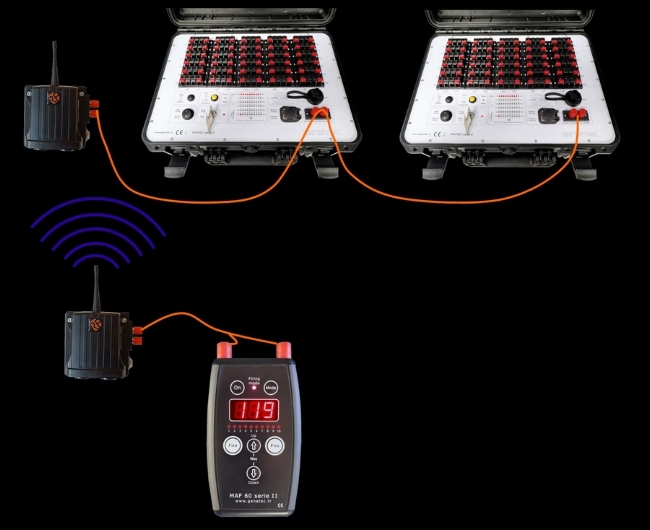 La télécommande est à relier au satellite par du classique fil bifilaire donc pas besoin de prévoir de câble numérique ou multipaire. La distance peut aller jusqu'à 5 kilomètres. Le satellite est équipé de soixante voyants lumineux de contrôle de résistance de ligne (chacun d'eux reste éteint si la ligne correspondante est trop chargée ou coupée), d'une clef pour passer en mode tir, d'un voyant de contrôle de bonne connexion avec l'unité de télécommande.