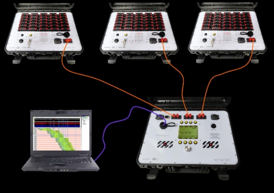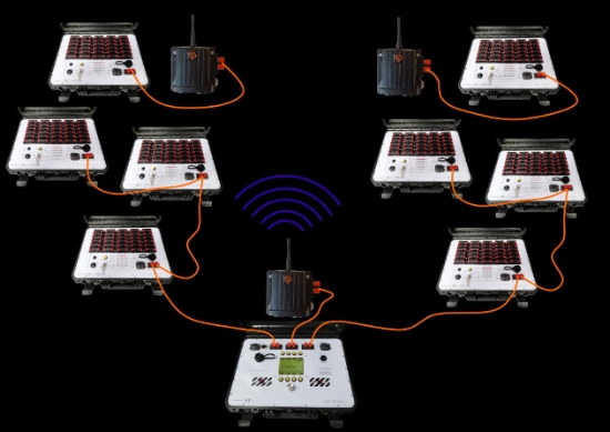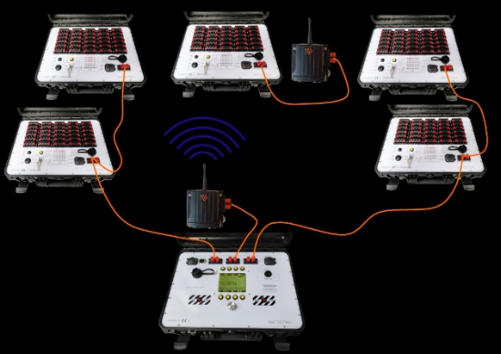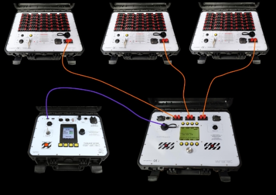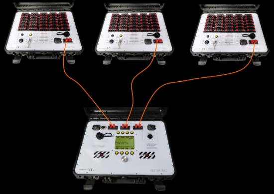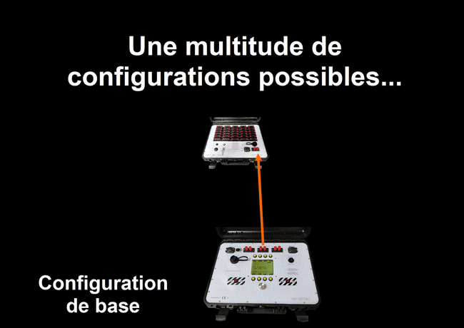 5/ Configuration avec deux satellites pilotés par radio HF et six satellites pilotés par fil : L'Oxydium envoie ses ordres à deux satellites par liaison radio indépendantes et six autres par fil.